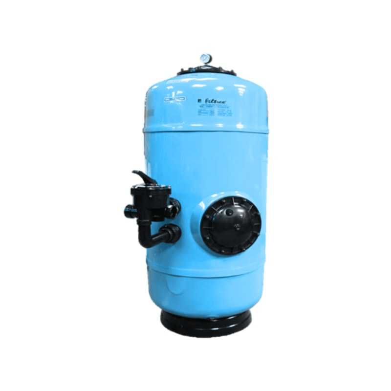 Üvegszál erősítésű laminált poliészter szűrőtartály közületi medencékhez, figyelőablakkal, vízgyűjtő tölcsérrel. Tartozéka a nyomásmérő óra és légtelenítőszelep. A szűrőágy kollektor karokkal van felszerelve.