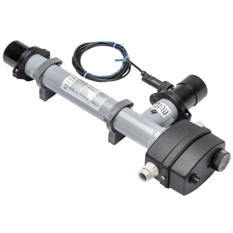 Kiváló minőségű fűtőpatron, áramlásszabályzóval, biztonsági termosztáttal, korrózióálló fűtőrudakkal. Úszómedencék, pezsgőfürdők és hasonló elemek fűtésére.